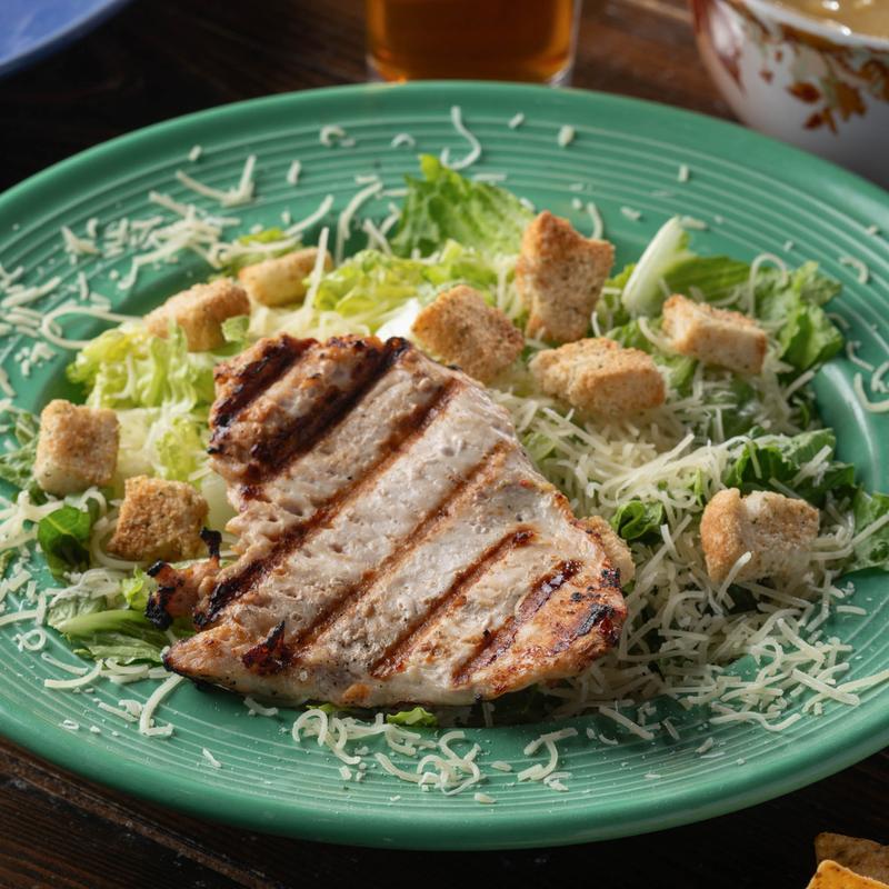 Fresh romaine lettuce tossed in Caesar dressing, topped with parmesan cheese, croutons