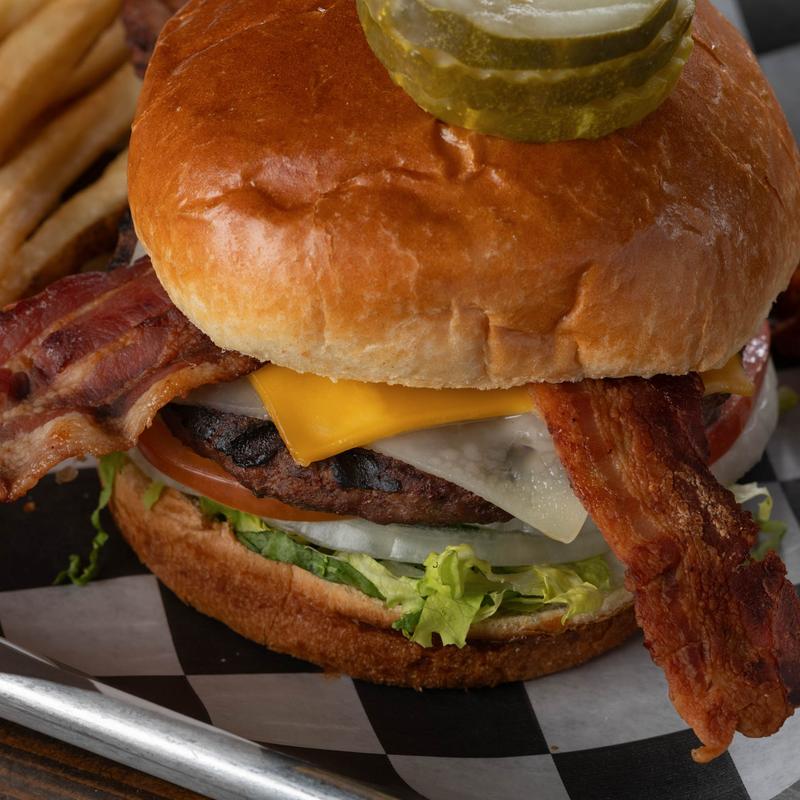 All burgers are served with lettuce, tomatoes, onions, & pickles. Your choice of cheese: American, Swiss, Cheddar, or Pepper Jack on a Brioche bun. Served with homemade chips, upgrade a side for $4 or for $5