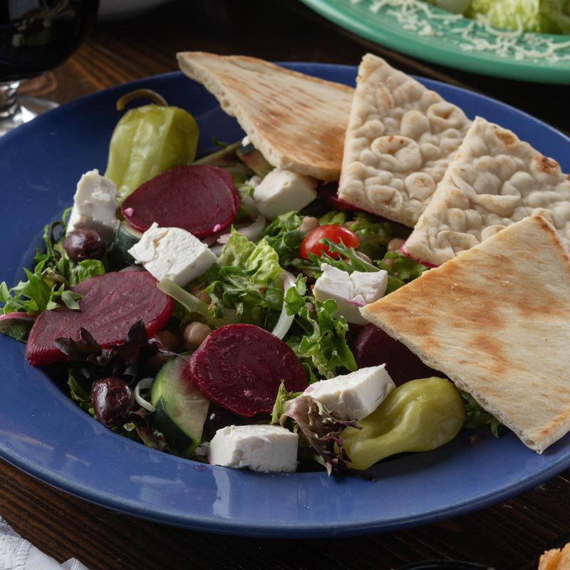 Local Mixed greens topped with tomatoes, cucumbers, red onions, chick peas, olives, pepperoncini, and feta cheese