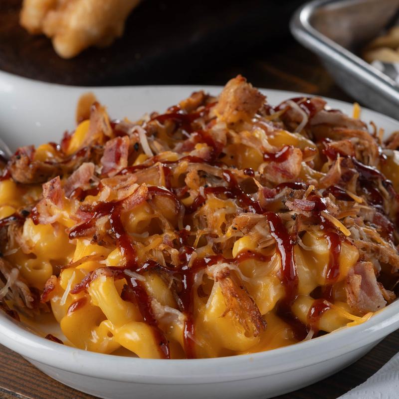 Slow smoked pulled pork, bacon chunks, & topped with house made BBQ sauce