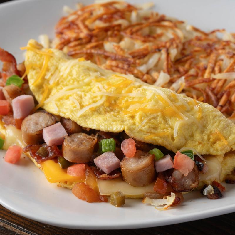 4 eggs, ham, bacon, sausage, tomatoes, onions, green peppers, mushrooms, American, and Swiss cheese