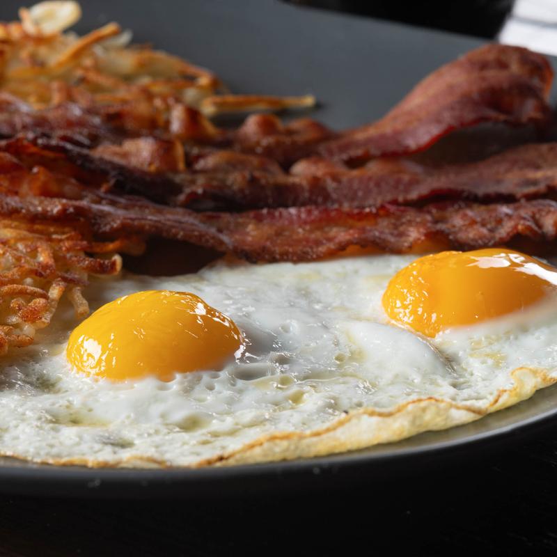 3 eggs with pit style ham, 2 sausage links and 2 strips of bacon